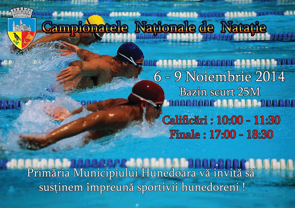 Joi,6 noiembrie se dă startul Campinatului Naţional de Nataţie 2014, bazin scurt 25m. Concursul se desfăşoară pe o perioadă de 4 zile,la Bazinul de Înot Hunedoara.