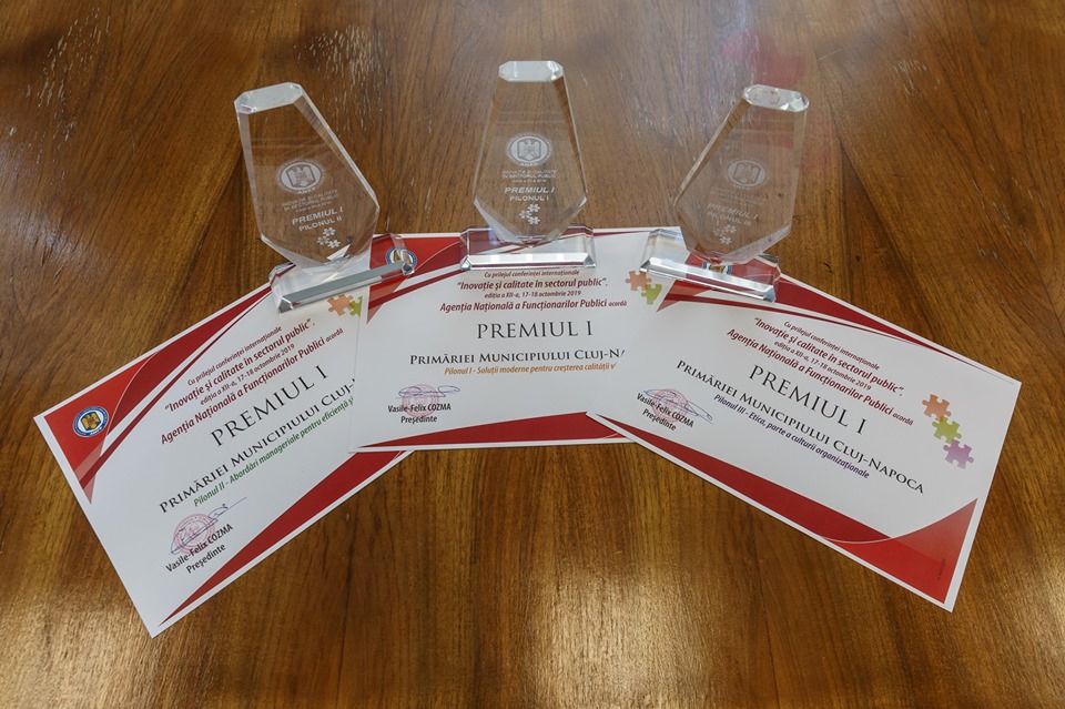 Primăria Cluj-Napoca a fost recompensată cu trei premii I în cadrul celei de-a XII-a ediţii a conferinţei internaţionale „Inovaţie şi calitate în sectorul public”, organizată de către Agenţia Naţională a Funcţionarilor Publici. Conferința s-a desfășurat în perioada 17 – 18 octombrie 2019, la Sâmbăta de Sus, județul Brașov.