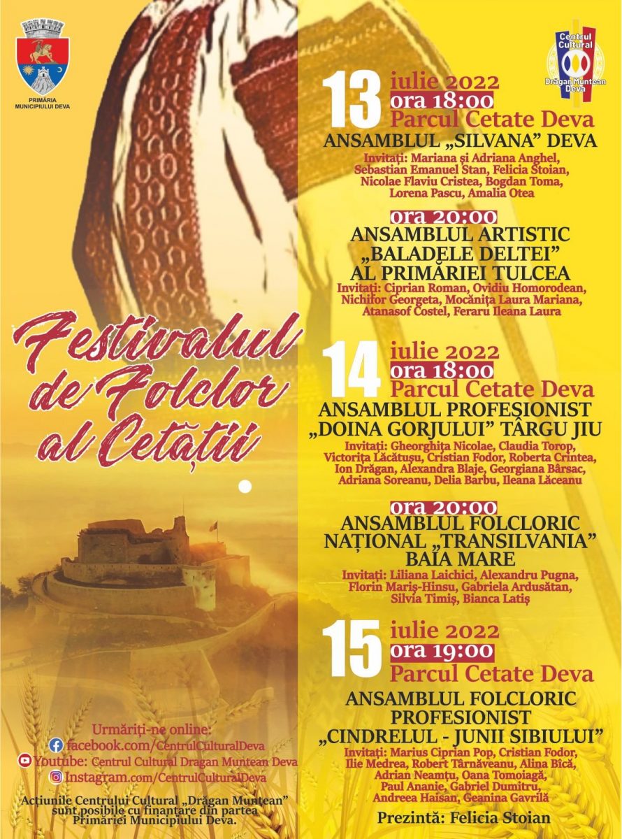 Primăria Municipiului Deva și Centrul Cultural „Drăgan Muntean” Deva vă invită în perioada 13-15 iulie 2022, în Parcul „Cetate” din Deva, la a doua ediție a „Festivalului de Folclor al Cetății”, un regal folcloric cu ansambluri și artiști de renume din toate zonele țării.