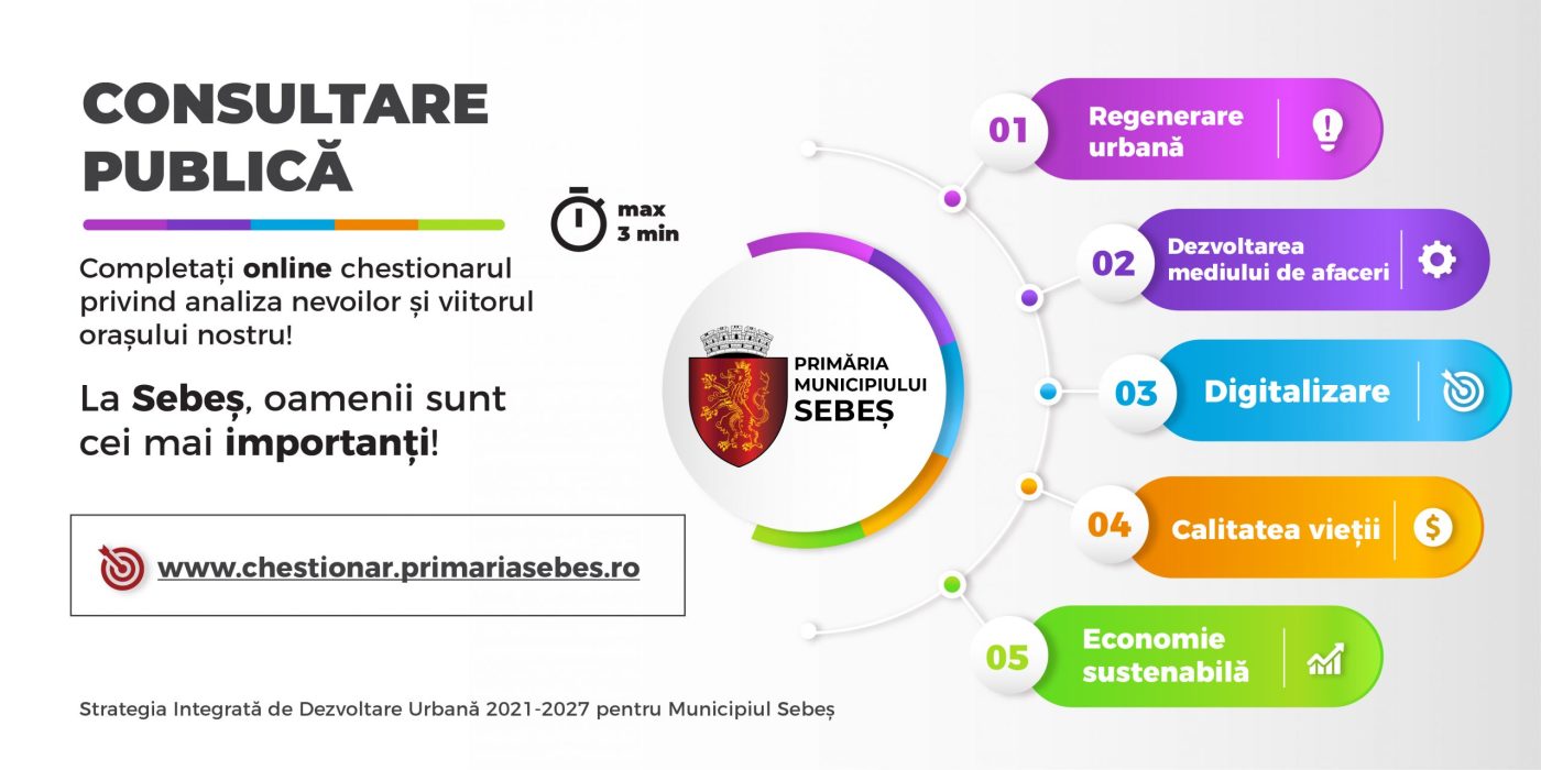 Municipiul Sebeș a demarat procesul de elaborare a Strategiei Integrate de Dezvoltare Urbană (SIDU) pentru perioada 2021-2027. În acest context, pentru culegerea informațiilor, a ideilor de proiecte, a opiniilor și observațiilor, cetățenii sunt invitați să completeze un chestionar de lucru care poate fi accesat atât pe site-ul www.primariasebes.ro, cât și pe platformele de socializare. Completarea chestionarului durează maximum 3 minute. De asemenea, primăria are dedicată și adresa de email: strategie2027@primariasebes.ro.În cadrul procesului de consultare publică se vor identifica principalele provocări de la nivelul municipiului, asigurându-se includerea nevoilor identificate în viitoarea strategie de dezvoltare și realizarea unui consens în ceea ce privește planificarea dezvoltării Municipiului Sebeș.Primarul Dorin Nistor le transmite mulțumiri tuturor cetățenilor care aleg să se implice în consultarea publică propusă pentru dezvoltarea viitoare a Sebeșului.