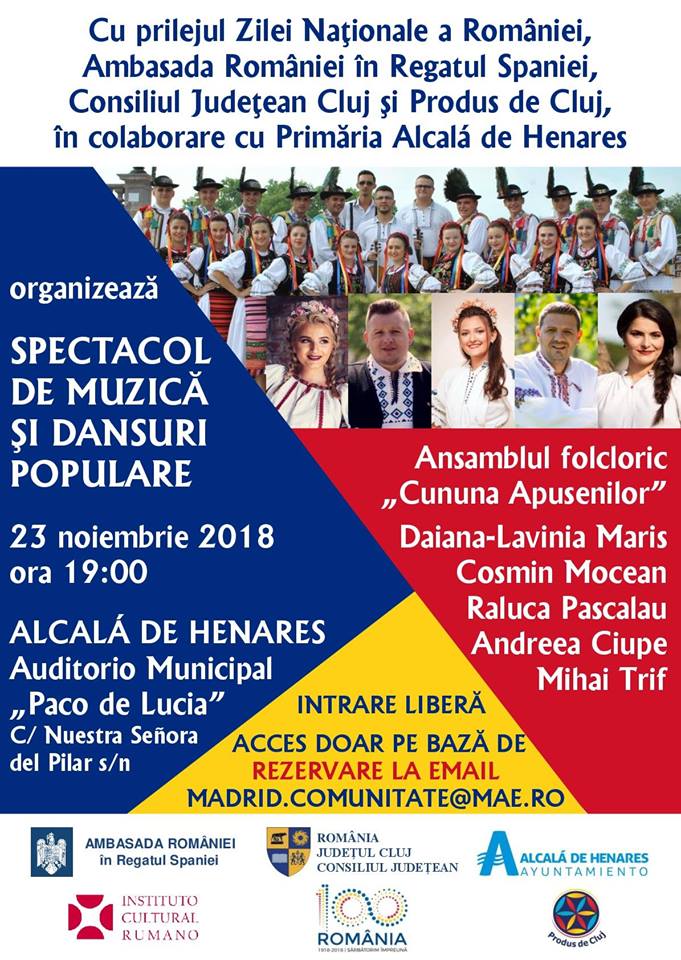 Vineri, 23 noiembrie 2018, la ora 19:00, românii sunt aşteptaţi în Alcalá de Henares, la spectacolul de muzică şi dansuri populare organizat de Ambasada României în Regatul Spaniei, Consiliul Judeţean Cluj şi Produs de Cluj, în colaborare cu Primăria Alcalá de Henares, pentru a sărbători Ziua Naţională a României.