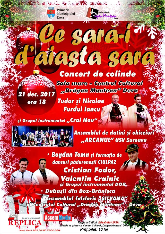 Primăria Municipiului Deva și Consiliul Local vă invită la un concert inedit de colinde, intitulat ”Ce sară-i d’aiasta sară”, care va avea loc joi, 21 decembrie 2017, la ora 18.00, în Sala mare a Centrului Cultural ”Drăgan Muntean”.