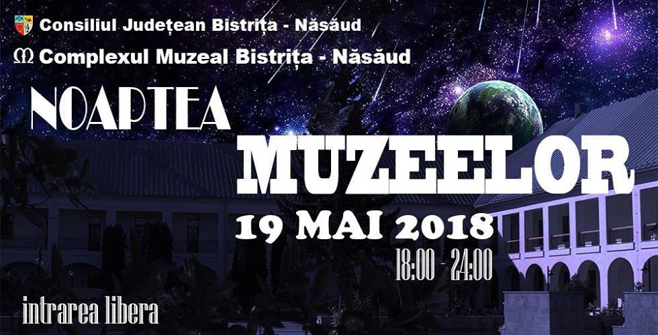 Complexul Muzeal Bistrița-Năsăud organizează sâmbătă, 19 mai, cea de-a XIV-a ediţie a Programului European „Noaptea Muzeelor”. Porțile principalelor secții muzeale existente în județul Bistrița-Năsăud – Muzeul Bistrița, Casa Argintarului, Muzeul Grăniceresc Năsăudean și Muzeul de Artă Comparată Sângeorz Băi- vor putea fi vizitate gratuit, în intervalul orar 18.00-24.00 (ora de intrare a ultimului vizitator este 23.45).