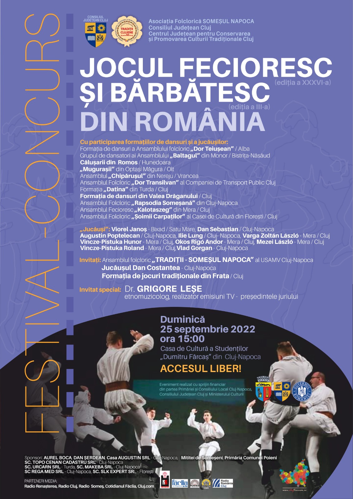 Mai multe ansambluri folclorice și jucăuși din toată țara vor lua parte duminică, 25 septembrie 2022, la Cluj-Napoca, la Festivalul-concurs „Jocul Fecioresc (ediția a XXXVI-a) și Bărbătesc (ediția a III-a) din România”.
