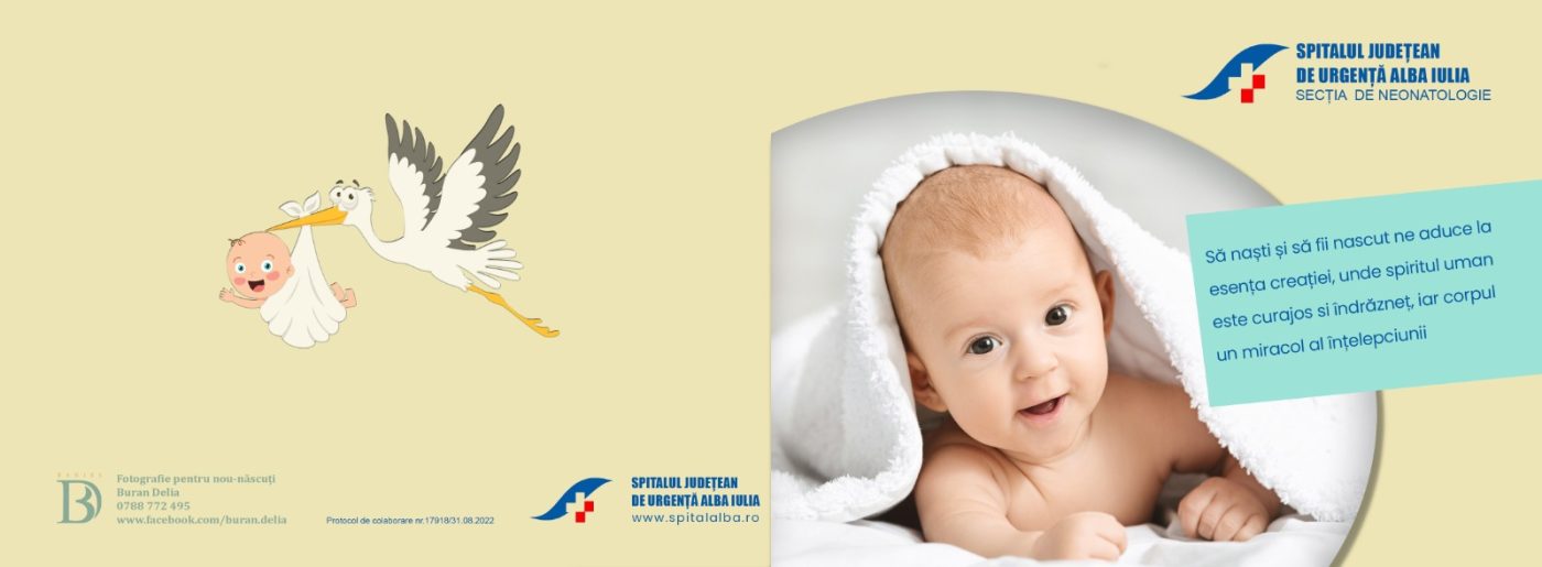 Prima fotografie cu bebelușul! Pacientele care nasc la Spitalul din Alba Iulia primesc fotografii cu nou-născuțiiSpitalul Județean de Urgență Alba Iulia va oferi, începând de astăzi, 26 septembrie 2022, pacientelor care nasc în cadrul unității medicale o fotografie cu bebelușul – prima din viața sa. Fotografia va fi proiectată pe un material de tip fluturaș/pliant care va contine și datele personale și medicale ale noului-născut (nume, prenume, data nașterii, greutate, lungime, circumferința capului, tip naștere, ora nașterii scor Apgar, numele mamei, numele medicilor ginecolog și neonatolog). De asemenea, fluturașul este însoțit de un mesaj pentru mame și copii: ”Să naști și să fii născut ne aduce la esența creației, unde spiritul uman este curajos și îndrăzneț, iar corpul un miracol al înțelepciunii”. Cadoul este oferit pacientelor în baza unui protocol de colaborare încheiat între Spitalul Județean de Urgență Alba Iulia și o firmă de profil. Sperăm că micul nostru cadou va fi pe placul mămicilor și le va aduce amintiri frumoase mereu!Biroul de presă al SJU Alba Iulia