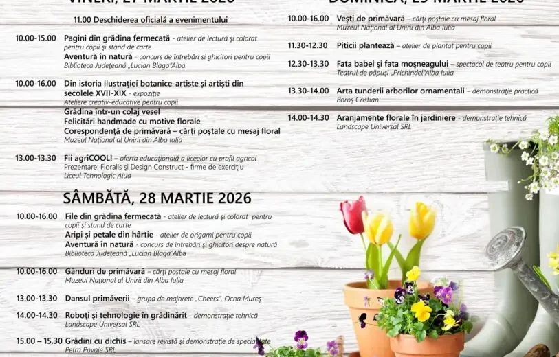 Muzeul Național al Unirii invită publicul, în perioada 27–29 martie 2026, la activități culturale și creative dedicate primăverii, organizate în cadrul Târgului Grădinarului, ediția 2026.