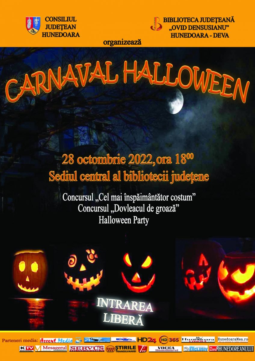 Vineri, 28 octombrie, de la ora 18.00, toți prietenii bibliotecii sunt așteptați la Carnaval. Curtea bibliotecii va fi împodobită în spiritul sărbătorii de Halloween, ajunsă la noi pe filieră anglo-saxonă. Copiii vor fi așteptați cu multe surprize, cu fotografii la minut și cu dulciuri.