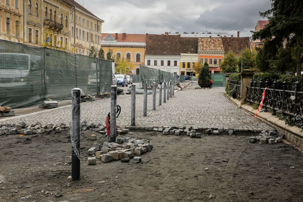 Lucrările din Piața Unirii (latura de Vest) vor fi gata pe 20 mai, cu excepția șantierului arheologic amenajat pe tronsonul din fața Bisericii Sf. Mihail, unde lucrările se vor încheia în preajma Zilelor Clujului.