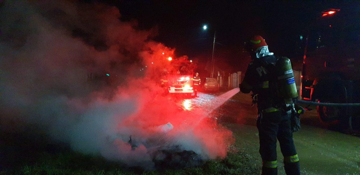 Stingere incendiu izbucnit la cauciucuri în localitatea Hrip. Sursa probabilă de aprindere, fiind acțiune intenționată.