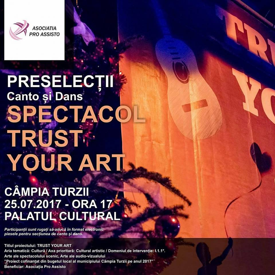 La Palatul Cultural” Ionel Floaşiu” al municipiului Câmpia Turzii se desfăşoară mâine, 25 iulie 2017, de la ora 17.00 sesiunea preselecţiilor spectacolului “TRUST YOUR ART!”