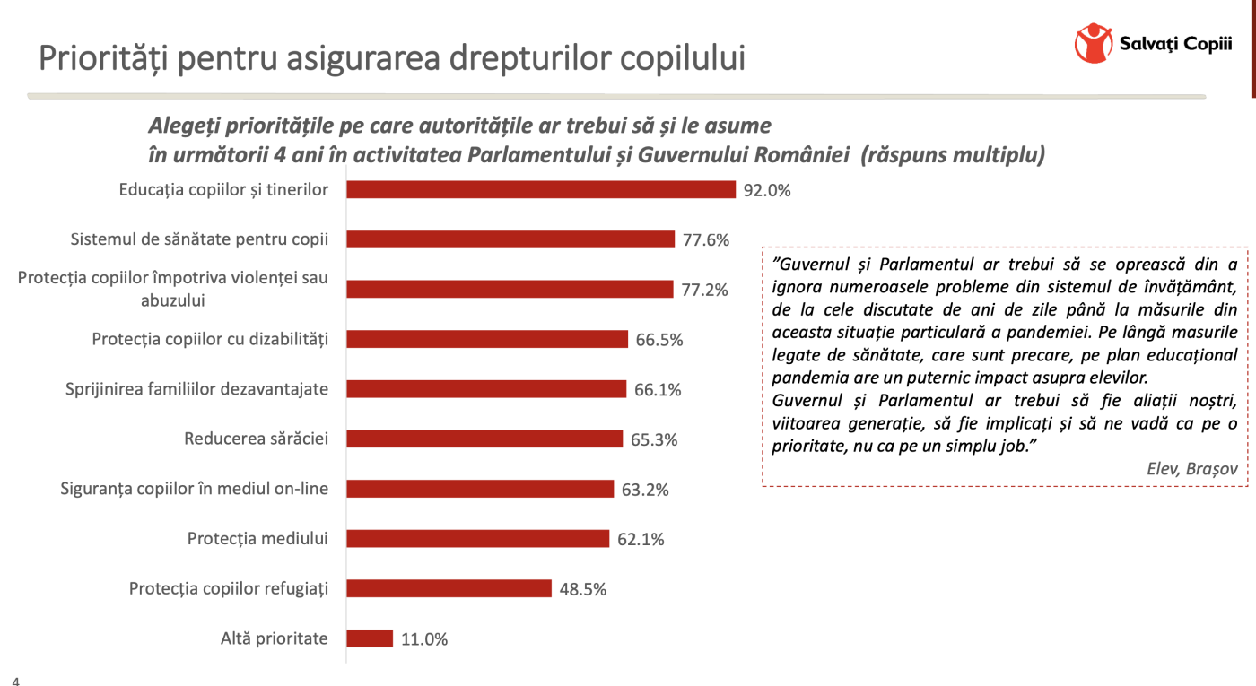 Cei mai mulți dintre părinți (78,4%) și profesori (73,1%) consideră că elevii trebuie să revină cât mai curând în băncile școlii, unde e nevoie de o regândire a programei școlare (80,9%) și de măsuri de educație remedială (43,7%). În ceea ce-i privește pe copii, 56,8% dintre ei se declară în favoarea redeschiderii școlilor, potrivit unui sondaj de opinie derulat de Organizația Salvați Copiii pe parcursul lunii decembrie.În privința revenirii la școală, datele complete ale anchetei online relevă că: