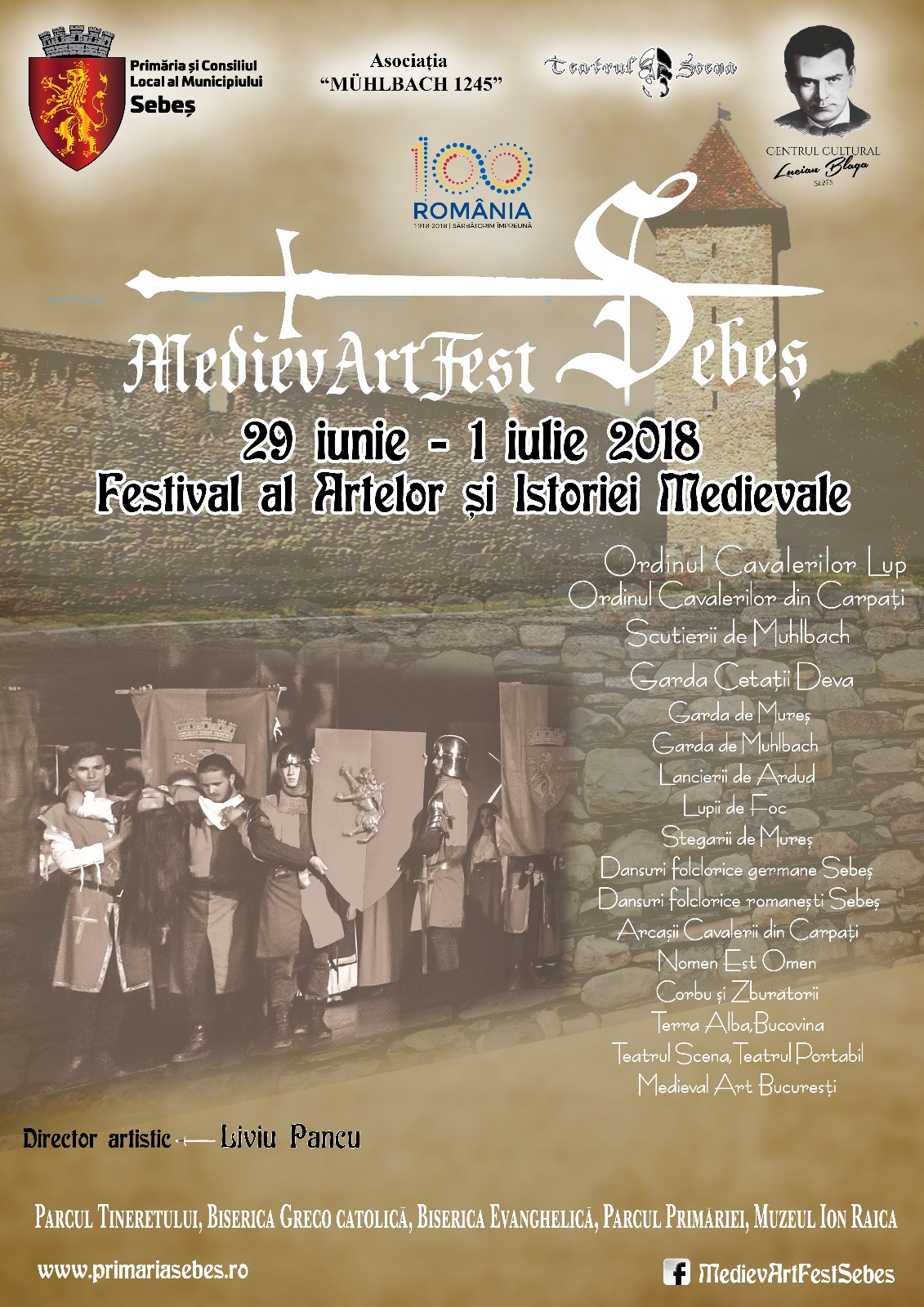 VINERI, 29 IUNIE 2018Centrul Cultural «Lucian Blaga» Sebeș18.00Vernisaj Expoziția de grafică și pictură ,,SEBEȘ între istorie și prezent” 19.00 Schimburi de idei privind turismul cultural, la Sebeș Proiecție de film documentar ,,700 de ani de Cavalerism”, Regia Victor Rădulescu – comentat și prezentat de Liviu Pancu – Teatrul ScenaParcul Tineretului – Parcul celor 100 de Cavaleri, Domnițe și Menestreli18.00Instalarea Taberelor Cavalerești și Corturilor MeșteșugăreștiTurnul Scutierilor de Muhlbach21.00Întâlnirea de taină a CavalerilorSÂMBĂTĂ, 30 IUNIE 2018Parcul Tineretului – Parcul celor 100 de Cavaleri, Domnițe și Menestreli9.30Gărzi Transilvane Scutierii de Muhlbach , Garda de Mureș, Garda Cetății DevaCu deplasare în diferite locații din SebeșScutierii Cetății Muhlbach, Garda de MureșGarda Cetății DevaStegarii de MureșLăncierii de Ardud10.00Animaţie în Cartierul celor 100 de CavalerilorTabere Ordine CavalereștiCursuri de Heraldică (pictură pe scuturi, grafică medievală)Medieval Art București11.00Școala Scutierilor de MuhlbachScutierii de Muhlbach11.30Școala Scutierilor LupOrdinul Cavalerilor LupGarda de MureșLăncierii de Ardud12.00Școala pajilor Lupi în ritmuri cavalerești Toboșarul Gărzii de Mureș Stegarii de Mureș12.30Povești cu eroi!Teatrul Portabil13.00 Parada Oficială – Ziua 1(traseu : Centrul Cultural “ Lucian Blaga”, Muzeul de istorie, Parcul Tineretului)Toată suflarea Festivalului14.30Pauza Tehnică16.00România 100 – Dansuri populare româneștiAnsamblu Sebeș16.20România 100 – Dansuri populare germaneAnsamblu Sebeș16.40Dansul Domnițelor din Cetatea DeveiDomnițele Cetății Deva17.00Școala Scutierilor Lup și Imițieri în Lumea Lupilor de FocOrdinul Cavalerilor Lup Lupoaicele de Foc17.20Școala Scutierilor de MuhlbachScutierii de Muhlbach17.40Recital – Nomen Est OmenNomen Est Omen18.00Concert – Terra AlbaTerra Alba19.00Deplasare către Biserica EvanghelicăToată Suflarea FestivaluluiBiserica Evanghelică20.00Recital de poezie religioasăBinecuvântare şi rugăciune pentru CavaleriTeatrul Scena Nomen est OmenPreotul Evanghelic21.00Parada cu torte deplasare în Cartierul CavalerilorToată Suflarea Festivalului21.15Salutul Ordinelor Cavalerești Muhlbach MMXVIII.MMToată Suflarea Festivalului21.30Concert – BucovinaBucovina, Teatrul Scena, Lupii de Foc, Garzile Transilvănene Sebeș 201822.30 Legenda arcașului Voievod și a celor 100 de săgeți – Moment aniversar România 100Arcașii Cetății Deva, Stegarii de Mureș, Ordinul Cavalerilor Lup, Lupii de Foc, Cavalerii din Carpați, Teatrul Scena23.00Spectacol cu focLupii de Foc23.30Retragere cu torțeToată Suflarea FestivaluluiTurnul Scutierilor de Muhlbach00.00Noaptea Lecturilor SecreteTexte din dramaturgia și poezia lui Lucian BlagaTeatrul Scena DUMINICĂ, 1 IULIE 2018Biserica Greco-Catolică9.00Rugăciunea Cavalerilor pentru Eroii Țării – România 100Toată suflarea CavalereascăParcul Tineretului – Parcul celor 100 de Cavaleri, Domnițe și Menestreli9.30Gărzi Transilvane Scutierii de Muhlbach , Garda de Mureș, Garda Cetății DevaCu deplasare în 2 cartiere din SebeșScutierii Cetății Muhlbach, Garda de MureșGarda Cetății DevaStegarii de MureșLăncierii de ArdudConcurs de Orientare Turistică de sorginte templieră ,,Drumul inițiațic al scutieruluiTeatrul Scena, Mediev Art București, Lupii de Foc10.00Animaţie în Cartierul celor 100 de CavalerilorTabere Ordine CavalereștiCursuri de Heraldică (pictură pe scuturi, grafică medievală)Concurs de Orientare Turistică de sorginte templieră ,,Drumul inițiațic al scutierului”Medieval Art BucureștiTeatrul ScenaTeatrul Portabil11.00Școala pajilor Lupi în Ritmuri Cavalerești Toboșarul Gărzii de Mureș Stegarii de Mureș 11.30Școala Scutierilor LupOrdinul Cavalerilor Lup, Garda de Mureș, Lăncierii de Ardud12.00Școala Scutierilor de MuhlbachScutierii de Muhlbach12.30Povești cu eroi!Teatrul Portabil13.00 Parada Oficială – Ziua 2(traseu : Centrul Cultural “ Lucian Blaga”, Muzeul de istorie, Parcul Tineretului)Toată suflarea Festivalului14.30Pauza Tehnică16.00România 100 – Dansuri populare româneștiAnsamblu Sebeș16.20România 100 – Dansuri populare germaneAnsamblu Sebeș16.40Dansul Domnițelor din Cetatea DeveiDomnițele Cetății Deva17.00Turnirul Lupilor și Imițieri în Lumea Lupilor de FocOrdinul Cavalerilor Lup Lupoaicele de Foc17.30Turnirul Scutierilor de MuhlbachScutierii de Muhlbach18.00Concert – Terra AlbaTerra Alba19.00Arborarea celor 100 de steaguri MedievArtFest SEBEȘ 2018Record în cadrul Centenarul Marii Uniri – România 100Teatrul Scena și toată suflarea festivalului19.30Concert – Nomen Est OmenNomen Est Omen20.15Salutul Ordinelor Cavalerești Muhlbach MMXVIII.MMToată Suflarea Festivalului20.30 Corbu și ZburătoriiBucovina, Teatrul Scena, Lupii de Foc, Garzile Transilvănene Sebeș 201821.30Spectacol cu focLupii de Foc22.30Retragere cu torțeToată Suflarea Festivalului