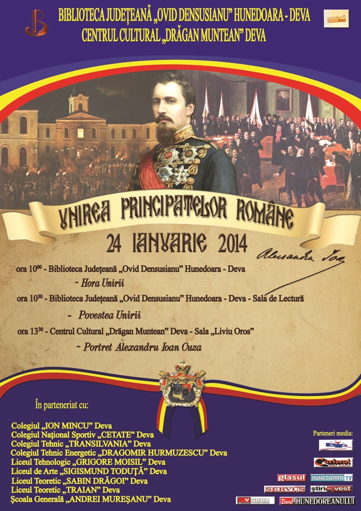 Ca in fiecare an, Biblioteca Judeteana „Ovid Densusianu” Hunedoara-Deva intampina si serbeaza si anul acesta, la 24 ianuarie, Ziua Unirii Principatelor Romane. Manifestarile dedicate acestui important moment din istoria României au scopul de a mentine vie in constiintele tuturor, in special in sufletele tinerilor, importanta Unirii de la 24 ianuarie 1859, de a evoca figurile luminoase ale celor care au faurit Unirea.