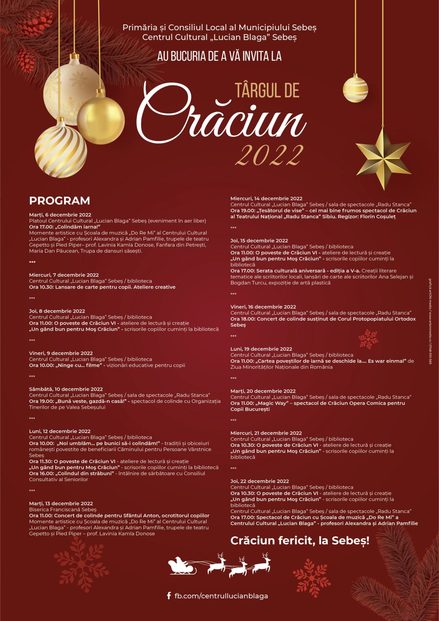 Marți, 6 decembrie 2022, începe târgul de Crăciun de la Sebeș. Atmosfera de sărbătoare va fi adusă de cei mai mici artiști ai orașului care frecventează școala de muzică și de teatru a Centrului Cultural „Lucian Blaga” Sebeș și care au bucuria de a deschide programul sărbătorilor de iarnă. De altfel, majoritatea evenimentelor de iarnă pregătite în acest an sunt dedicate copiilor, care beneficiază zilnic de ateliere creative la bibliotecă, plus vizionări de filme, întâlniri cu personaje de poveste unice, așa cum doar la biblioteca din Sebeș se pot întâmpla. Un dar special pentru publicul nostru este și spectacolul de magie care vine tocmai de la Opera Comica pentru Copii București, marți 20 decembrie.