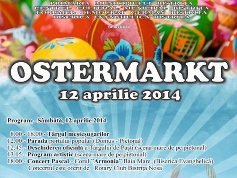 Bistriţenii şi oaspeţii lor sunt invitaţi sâmbătă, 12 aprilie 2014, la Târgul de Paşti – Ostermarkt. Târgul va fi amenajat în zona pietonală „Liviu Rebreanu” şi va oferi vizitatorilor atât prilejul de a achiziţiona produse pascale (prăjituri, ouă încondeiate), împletituri, vase din ceramică şi multe alte obiecte de artizanat, cât şi de a participa la un diversificat program cultural.