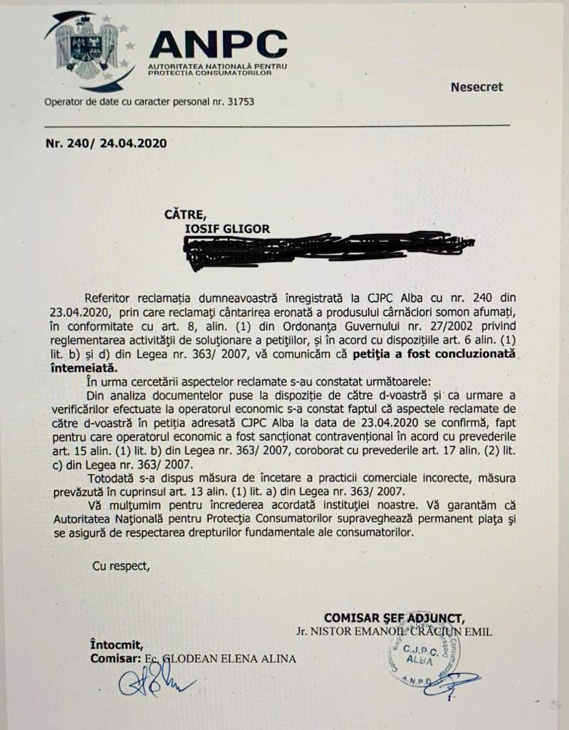 In data de 23.04.2020, am depus la Comisariatul Judetean pentru Protectia Consumatorilor Alba o sesizare, in care semnalam faptul ca am cumparat de la Selgros Alba Iulia, carnaciori somon afumati (factura SLG 620113005111) de la raionul Pescarie si am constatat ca am platit 2 kg, in conditiile in care, in punga erau fix 1,044 kg! Am fost furat la cantar cu 956 grame, adica 67,13 lei! Am mai sesizat faptul ca nu exista un cantar special pentru cumparatori, precum si atitudinea sefei de raion, Roxana Gherman. (Vezi aici) In urma verificarilor efectuate de comisarii de la Comisariatul Judetean pentru Protectia Consumatorilor Alba mi s-a comunicat ca: ,,petitia a fost concluzionata intemeiata” si ,,se confirma, fapt pentru operatorul economic a fost sanctionat contraventional”. De asemena:,,s-a dispus masura de incetare a practicii incorecte”. Dupa publicarea articolului am primit sute de reactii si peste 1.700 de like-uri si va multumesc pentru asta! Recomand tuturor celor care mi-ati scris ca v-ati confruntat cu situatii similare, sa va adresati cu incredere Comisariatului Judetean pentru Protectia Consumatorilor Alba (Alba Iulia, bd. Octavian Goga nr. 9, cod 510150, Tel.: 0258/811.946, Fax: 0258/811.946, Email: reclamatii.alba@anpc.ro) si, foarte important, sa luati atitudine si sa cereti sa fiti respectati. Lucratorii comerciali trebuie sa inteleaga ca meseria lor presupune multa politete, corectitudine si, mai ales, sa-si recunoasca greselile pe care le comit!IOSIF GLIGOR