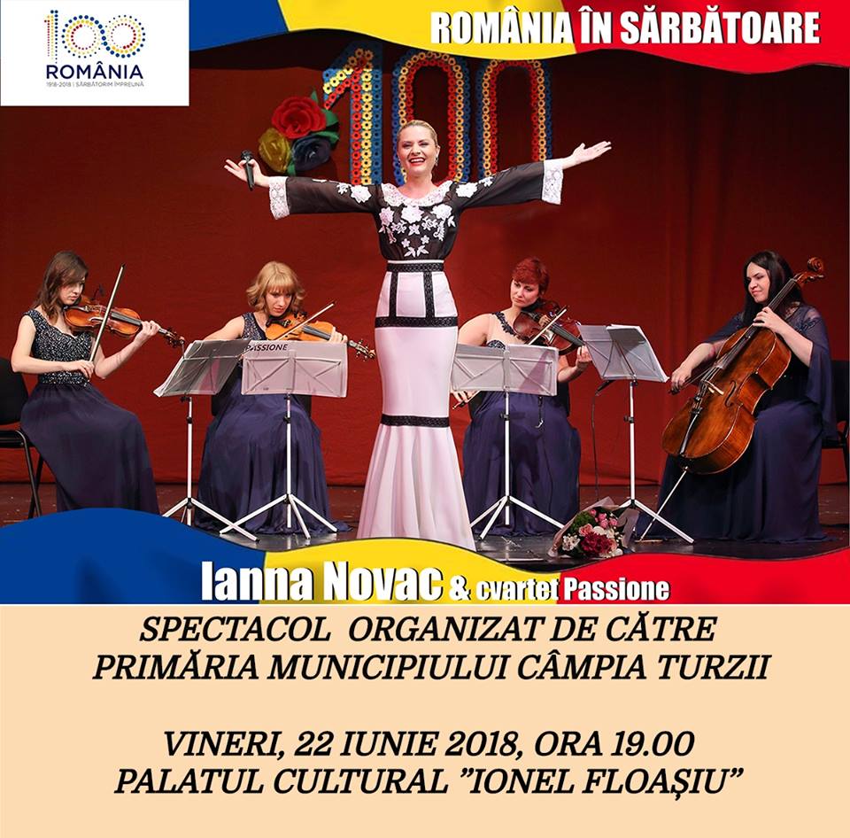 Primăria și Consiliul Local al Municipiului Câmpia Turzii organizează vineri, 22 iunie, cu începere de la ora 19:00, un spectacol de muzică simfonică susținut de solista Ianna Novac, care va fi acompaniată de Cvartetul Passione.