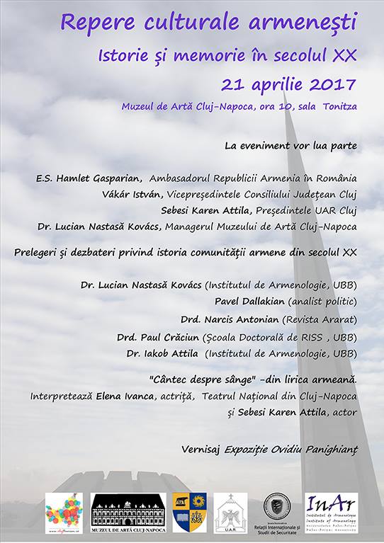 Muzeul de Artă Cluj-Napoca, instituţie de cultură care funcţionează în subordinea Consiliului Judeţean Cluj, organizează vineri, 21 aprilie 2017, începând cu ora 10.00, Știriul ,,Repere culturale armeneşti. Istorie şi memorie în secolul XX”, dedicat promovării artei, culturii, memoriei şi identităţii comunităţii armene din România.