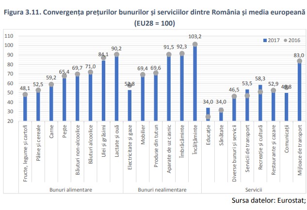 România este a doua cea mai ieftină țară din UE în privința prețurilor la produse și servicii, în raport cu media europeană. Astfel, potrivit ultimului raport al Consiliului Concurenței, publicat joi, în 2017, nivelul general al prețurilor din România se afla la 48,4% din media europeană, cel mai redus nivel, după cel înregistrat în Bulgaria (44%). La polul opus, consumatorii care achită cele mai mari prețuri sunt cei din Danemarca (141,2% din media UE), Luxemburg (141%) și Suedia (134,7%). Consumatorii români plătesc cele mai mici prețuri din Uniunea Europeană pentru produsele alimentare și băuturi non-alcoolice (aproximativ 38% față de media comunitară), cele mai sugestive diferențe fiind în cazul fructelor și legumelor, al căror preț este de două ori mai mic decât media eropeană, al produselor de panificație care sunt cu 47,5% mai ieftine și al produselor din carne (-40,8%). Alte diferențe semnificative, potrivit raportului Consiliului Concurenței, se remarcă în cazul serviciilor de sănătate al căror preț reprezintă 32,2% din media UE, de educație (34%), precum și în cazul utilităților (electricitate și gaze – 38,6%).Există însă și cazuri unde consumatorii români plătesc prețuri similare sau chiar mai mari decât ceilați europeni, cum este cazul lactatelor și a ouălor, al căror preț reprezintă 90,2% din media UE, al aparatelor de uz casnic (91,5%), articolelor de îmbrăcăminte (92,3%) și de încălțăminte (103,2%).În ciuda prețurilor mai reduse înregistrate în România și în celelalte State Membre din Europa Centrală și Est, există diferențe semnificative în ceea ce privește puterea de cumpărare între consumatorii din aceste economii emergente și cei din economiile dezvoltate din UE, se precizează în raport. În ceea ce privește prețul carburanților, consumatorii români plătesc peste media europeană și cea regională în ceea ce privește prețurile fără taxe la benzină și motorină, dar sub aceasta în cazul prețurilor de la pompă (cele cu taxe). În cazul motorinei, carburant utilizat preponderent de consumatorii români și de către transportatorii de mărfuri, un litru costa echivalentul a 1,27 euro în octombrie 2017, în timp ce media europeană era de 1,38 euro, iar în țările vecine, acesta poate fi achiziționat cu sume cuprinse între 1,14 (Bulgaria) și 1,17 euro (Ungaria), se mai arată în raport. (vezi aici)