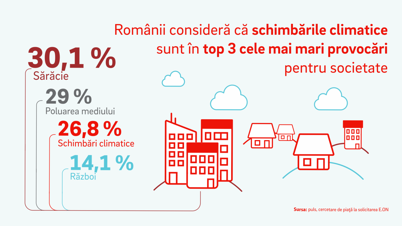 E.ON: Preţul CO2 ar putea fi o premisă clară pentru ca industria să reducă emisiile de CO2 FließtextConform unui sondaj recent realizat de către institutul de cercetare puls în numele E.ON, în mai multe ţări europene între care România, unu din patru români (26,8%) consideră că schimbările climatice reprezintă în prezent cea mai mare provocare pentru societate. Cetăţenii români sunt mai îngrijoraţi atunci când vine vorba despre poluarea mediului (29%) şi mai ales de sărăcie (30,1%), dar mai puţin de război – care în prezent îi îngrijorează numai pe 14,1% dintre români.Mai mult decât atât, 76,7% din cetăţenii români sunt gata să îşi schimbe comportamentul în ceea ce priveşte transportul, mediul de locuit, mâncarea sau cumpărăturile, iar unii deja au şi făcut-o. Totodată, 44,3% din populaţia României declară că este gata să plătească cu până la 5% mai mult pentru produse nepoluante pe când o altă treime (34,5%) ar plăti cu până la 10% mai mult pentru produse sustenabile.83% dintre români sunt de părere că România nu depune suficiente eforturi pentru reducerea gazelor cu efect de seră iar jumătate susţin că fiecare dintre noi trebuie să ia măsuri pentru reducerea acestora, în timp ce 25,8% consideră că rolul cel mai important îl are statul iar 23,9% industria.Pentru a combate emisiile de gaze cu efect de seră, 88,6% dintre români cred că ar trebui în primul rând să fie susţinute sursele de energie alternative, prietenoase cu mediul.“Sondajul nostru de opinie indică faptul că populaţia e pregătită să contribuie la reducerea dăunătoarelor gaze de seră. E.ON s-a exprimat de ceva vreme în favoarea creşterii preţului CO2, pentru a stimula promovarea şi implementarea unor forme alternative de energie, prietenoase cu mediul. În plus, soluţiile noastre energetice sprijină companiile, oraşele şi consumatorii finali în eforturile lor de a reduce sustenabil emisiile de CO2”, declară Johannes Teyssen, Director General Executiv al E.ON SE.