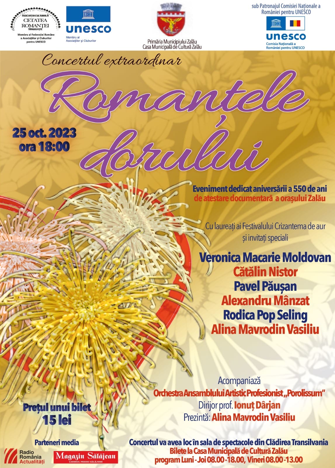 Primăria Municipiului Zalău și Casa Municipală de Cultură Zalău vă invită la concertul extraordinar „Romanțele dorului”, dedicat aniversării a 550 de ani de atestare documentară a orașului Zalău, în data de 25 octombrie 2023, de la ora 18,00, în Sala Transilvania.