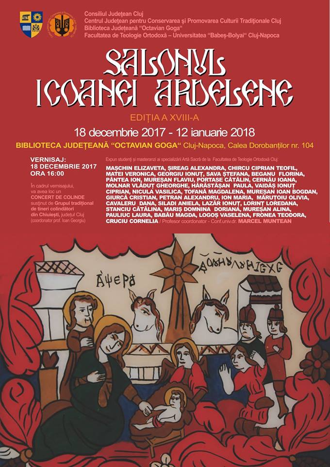 Centrul Judeţean pentru Conservarea şi Promovarea Culturii Tradiţionale Cluj, instituție de cultură aflată sub autoritatea Consiliului Judeţean Cluj, deschide expoziția organizată anual, Salonul Icoanei Ardelene, Știri ce va avea loc luni, 18 decembrie 2017, ora 16:00, în foaierul Bibliotecii Județene Octavian Goga, Calea Dorobanților, nr.104.