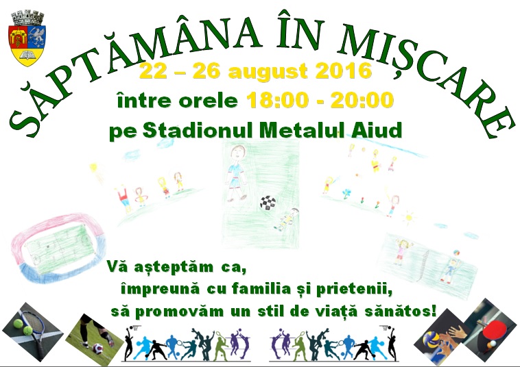 În perioada 22 – 26 august 2016, Primăria și Consiliul Local al Municipiului Aiud organizează pentru prima dată evenimentul ”Săptămâna în mișcare”.Noul proiect este o invitație lansată tuturor aiudenilor, indiferent de vârstă, pentru promovarea unui stil de viață sănătos.În ședința Consiliului Local al Municipiului Aiud din 27 iulie 2016, a fost aprobată completarea anexei la HCL 261/17.12.2015 privind aprobarea calendarului principalelor evenimente organizate direct de către Primăria și Consiliul Local al municipiului Aiud în anul 2016, cu evenimentul ”Săptămâna în mișcare”.Obiectivul acestui eveniment este acela de a sprijini sportul în masă, în beneficiul comunității, dar și de a-i apropia pe aiudeni, prin sport și mișcare, noul proiect fiind o invitație lansată tuturor aiudenilor, indiferent de vârstă, pentru promovarea unui stil de viață sănătos.Astfel, timp de o săptămână, în perioada 22 – 26 august 2016, începând cu ora 18:00 pe Stadionul Metalul din Aiud, vor fi organizate activități sportive diversificate la care pot participa aiudeni de toate vârstele.Fiecare seară va debuta cu un program de gimnastică în ritmul muzicii, program condus de instructori specializați în acest sens.Evenimentul se va încheia vineri, 26 august 2016, cu un meci demonstrativ între foștii fotbaliști ai echipelor Metalul Aiud și Olimpia Aiud, precum și cu o defilare a cluburilor sportive din Aiud.