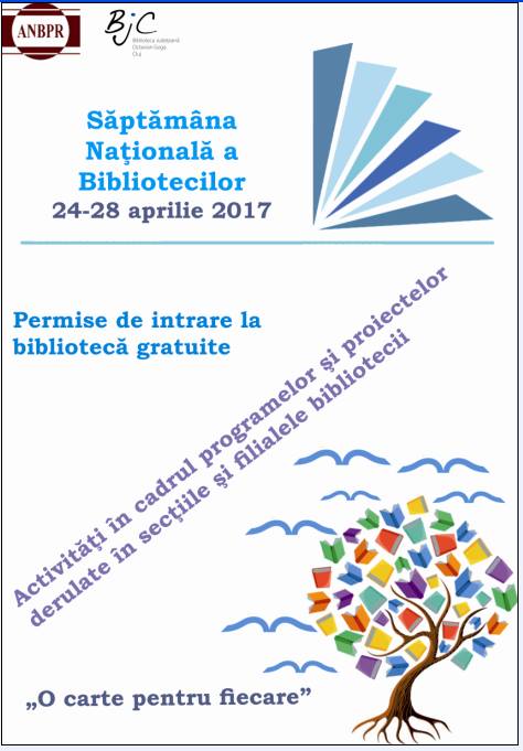 Biblioteca Judeţeană „Octavian Goga” Cluj, instituţie de cultură aflată sub autoritatea Consiliului Judeţean Cluj, în colaborare cu Asociaţia Naţională a Bibliotecarilor şi Bibliotecilor Publice din România, Filiala Cluj, organizează o serie de activităţi culturale sub egida Săptămânii Naţionale a Bibliotecilor, ediţia a XIII-a (24-28 aprilie 2017).