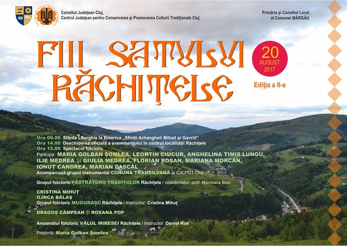 Centrul Judeţean pentru Conservarea şi Promovarea Culturii Tradiţionale Cluj, instituție de cultură aflată în subordinea Consiliului Judeţean Cluj, împreună cu Primăria și Consiliul Local al comunei Mărgău, invită iubitorii de folclor la cea de-a doua ediție a sărbătorii „Fiii satului Răchițele”, care va avea loc duminică, 20 august 2017.
