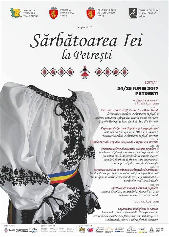 În zilele de 24 şi 25 iunie, începând cu ora 9, va avea loc, la Petreşti, „Sărbătoarea Iei”. Evenimentul, aflat la prima sa ediţie, este organizat de Asociația Temerarii Transalpina Petrești, în parteneriat cu Primăria Municipiului Sebeș, Consiliul Local al Municipiului Sebeș, Centrul Cultural „Lucian Blaga” Sebeș, Parohiile Ortodoxe I și II Petrești, Parohia Evanghelică Petrești, Școala Gimnazială Petrești și Asociația Fanfara Petrești. Scopul acestui eveniment este de a promova ia, ca simbol al portului popular românesc, în strânsă legătură cu tradiţiile legate de sărbătoarea Sânzienelor și a Nașterii Sf. Proroc Ioan Botezatorul. Dorim să contribuim la promovarea valorilor româneşti în rândul tinerei generații, în contextul în care, în data de 24 iunie este marcată Ziua Universală a Iei. Comunitatea locală va îmbrăca un aer de sărbătoare, iar portul popular va fi în centrul atenţiei. Programul zilei de sâmbătă, 24 iunie, cuprinde:Prăznuirea Nașterii Sf. Proroc Ioan Botezătorul (Sânzienele);Expoziţie de costume populare și fotografii vechi ilustrând portul popular; Parada Portului Popular, însoțită de Fanfara din Petrești;Premierea celor mai autentice costume populare și înmânarea diplomelor pentru cei mai reprezentativi promotori locali, ai folclorului românesc;Standuri cu vânzare obiecte de artizanat și handmade, confecționate de voluntarii Asociației Temerarii Transalpina în cadrul atelierelor de creație și artizanat; standuri cu produse tradiționale locale;Spectacol de muzică și dansuri populare, susținut de soliști, ansambluri și formații artistice locale.Duminică, 25 iunie, va fi organizat un picnic în natură, împreună cu tinerii și copiii din Petrești, care vor decora biciclete cochete cu flori, îmbrăcați în ii tradiționale, pentru a culege flori de sânziene.Asociaţia Temerarii Transalpina are drept scop promovarea şi susţinerea intereselor comune ale tinerilor pe plan local, naţional şi internaţional, în vederea creării posibilităţilor de participare a acestora la viaţa socială, cultural-artistică şi sportivă, prin realizarea şi coordonarea de activităţi care să contribuie la dezvoltarea societăţii/comunităţii, din punct de vedere economic, social, educaţional, cultural, ecologic, turistic şi sportiv. Compartimentul Relaţii Publice şi Comunicare Primăria Municipiului Sebeş
