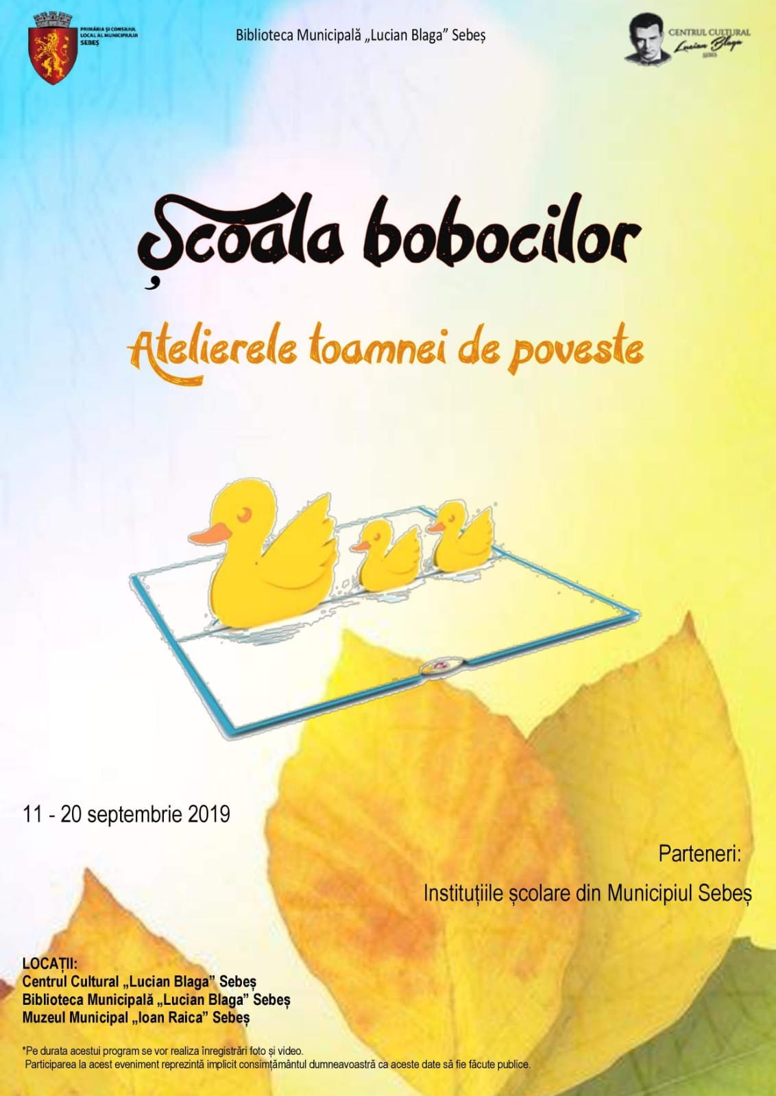 Primăria și Consiliul Local al Municipiului Sebeș, Centrul Cultural „Lucian Blaga” Sebeș, Biblioteca Municipală „Lucian Blaga” Sebeș organizează – ȘCOALA BOBOCILOR – un program dedicat elevilor din ciclul primar al școlilor din municipiul Sebeș. Astfel, în perioada 11-20 septembrie 2019, participanții vor intra în atmosfera de toamnă, într-un mod inedit, prin lectură, creativitate și joacă, în cadrul Atelierelor toamnei de poveste.Vom aduce culorile toamnei în mâinile copiilor pentru a le pune la încercare imaginația, spiritul creativ și îndemânarea prin diverse activități și jocuri distractive.