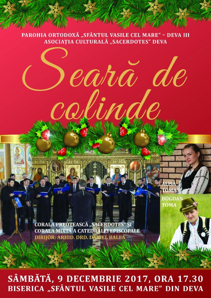 Cu binecuvântarea Preasfințitului Părinte Gurie, Episcopul Devei și al Hunedoarei, sâmbătă, 9 decembrie 2017, de la ora 17.30, în biserica „Sf. Vasile cel Mare” din Deva se va desfășura un frumos concert de colinde, susținut de Corala „Sacerdotes” a Episcopiei Devei și Hunedoarei și de Corala mixtă a Catedralei Episcopale din Deva (sub bagheta P. C. Părinte Arhid. Daniel Balea), respectiv de îndrăgiții interpreți hunedoreni de muzică populară Alisa Toma și Bogdan Toma.