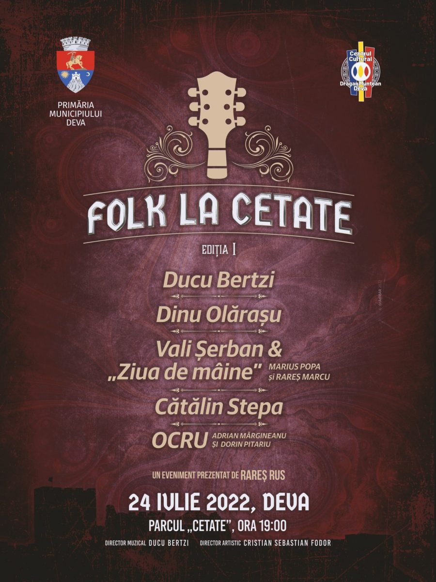 Primăria Municipiului Deva și Centrul Cultural „Drăgan Muntean” Deva vă invită în 24 iulie 2022, de la ora 19:00, la prima ediție a Festivalului „Folk la Cetate”.