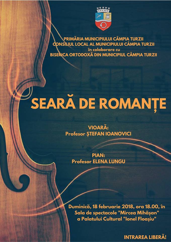 Primăria și Consiliul Local al Municipiului Câmpia Turzii, în colaborare cu Biserica Ortodoxă Câmpia Turzii, organizează duminică, 18 februarie 2018, cu începere de la ora 18:00 la „Seară de Romanțe”.