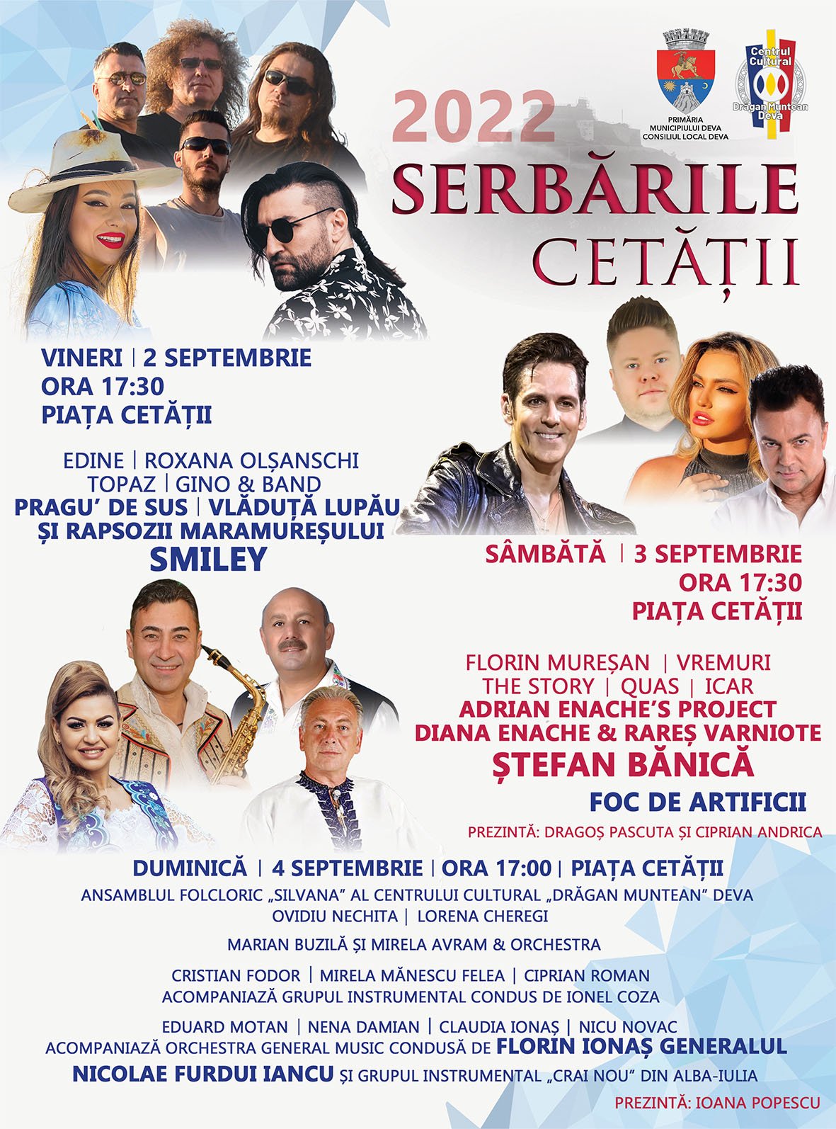 Primăria Municipiului Deva și Centrul Cultural „Drăgan Muntean” Deva organizează, în perioada 2-3-4 septembrie, Serbările Cetății 2022.
