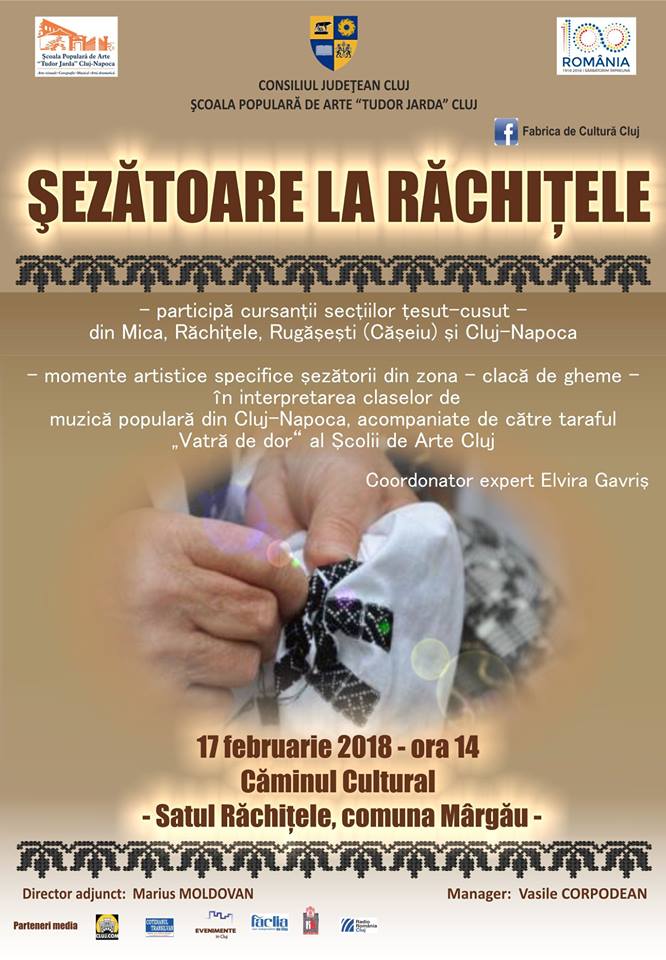 Şcoala Populară de Arte „Tudor Jarda”, instituţie subordonată Consiliului Judeţean Cluj organizează sâmbătă, 17 februarie, 2018, ora 14.00, în Căminul Cultural din localitatea Răchiţele, comuna Mărgău, o şezătoare la care participă cursantele secţiilor ţesut-cusut din Mica, Răchiţele, Rugăşeşti (Căşeiu) şi Cluj-Napoca.