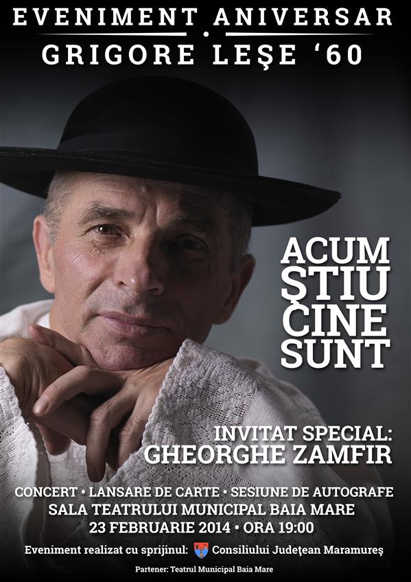 Sub genericul „Acum ştiu cine sunt”, duminică 23 februarie, începând cu ora 19.00, la Teatrul Municipal din Baia Mare va avea loc spectacolul aniversar „Grigore Leşe – 60”. La acest eveniment, realizat cu sprijinul Consiliului Judeţean Maramureş, invitat de onoare va fi naistul Gheorghe Zamfir.