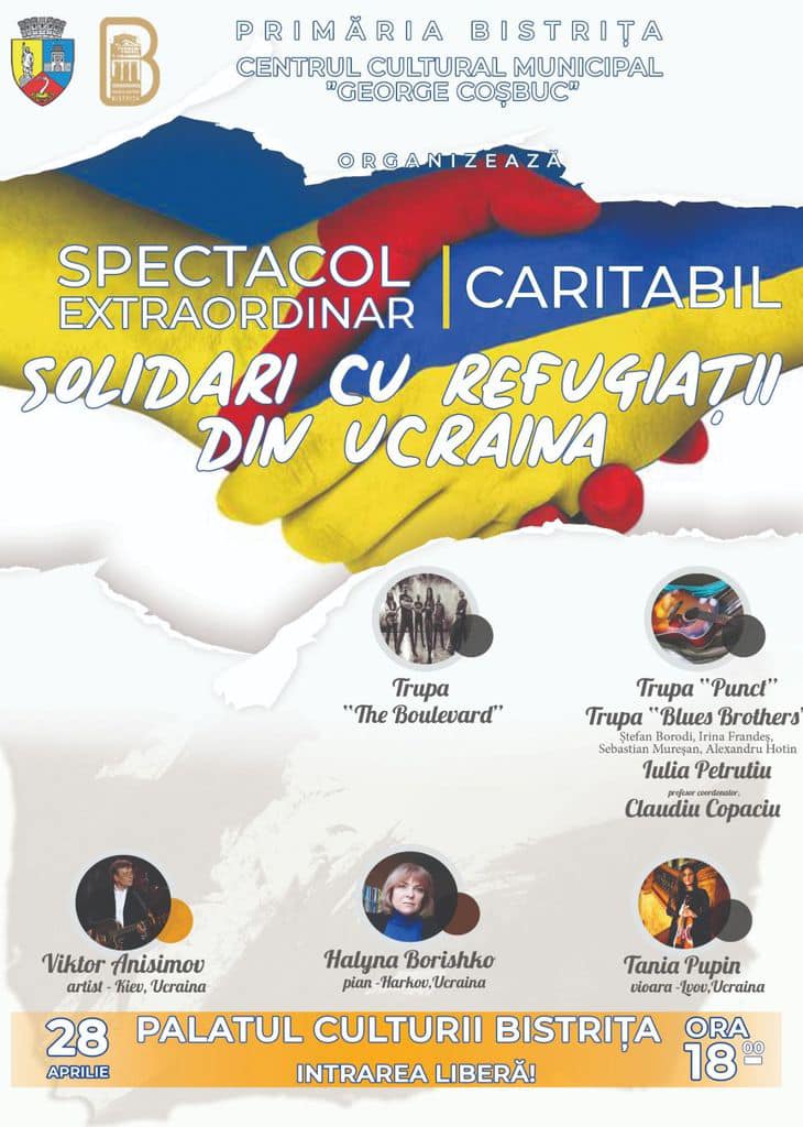 Centrul Cultural Municipal „George Cosbuc” Bistrita organizează la Palatul Culturii spectacolul caritabil „Solidari cu refugiații din Ucraina”.