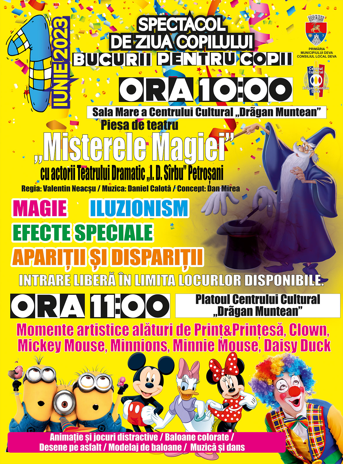 Primăria Municipiului Deva și Centrul Cultural ,,Drăgan Muntean” organizează, joi, 1 iunie 2023, un spectacol extraordinar dedicat „Zilei Copilului”, intitulat „Bucurii pentru copii”.
