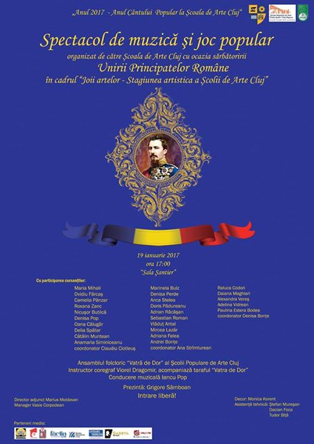 Şcoala Populară de Arte „Tudor Jarda” Cluj, instituţie subordonată Consiliului Judeţean Cluj, invită iubitorii de folclor joi, 19 ianuarie 2017, ora 17.00, în Sala „Şantier” de pe str. Fabricii de Zahăr nr. 51, la spectacolul de muzică şi joc popular dedicat Unirii Principatelor Române – Moldova şi Ţara Românească – de la 24 ianuarie 1859.