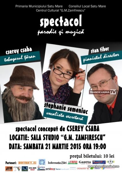 Sâmbătă, 21 martie 2015 de la ora 19.00 la Centrul Cultural „G.M.Zamfirescu” va avea loc un spectacol de parodie şi muzică cu trei protagonişti cunoscuţi publicului sătmărean din alte producţii organizate de instituţia noastră: Csaba Cserey (toboşarul ţăran), Stephanie Semeniuc (vocalista secretară) şi Stan Tibor (pianistul director).