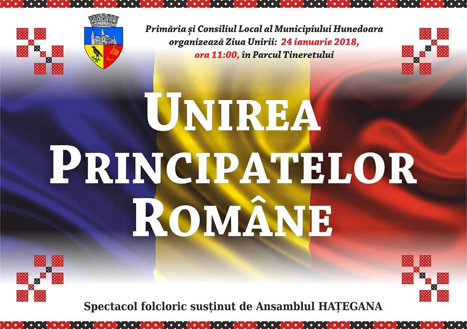 Primăria Municipiului Hunedoara organizează miercuri, 24 ianuarie 2018, cu ocazia împlinirii a 159 de ani de la Unirea Principatelor Române, un spectacol de dans și muzică populară susținut de Ansamblul de Cântece și Dansuri „Hațegana”.