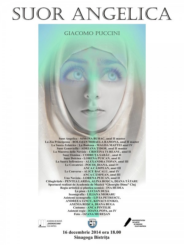Centrul Județean pentru Cultură în colaborare cu Societatea de Concerte Bistrița și Academia de Muzică “Gheorghe Dima” Cluj-Napoca prezintă marți 16 decembrie 2014, ora 18, la Sinagoga Bistrița, spectacolul extraordinar de teatru și muzică ,,Suor Angelica”, după Giacomo Puccini.