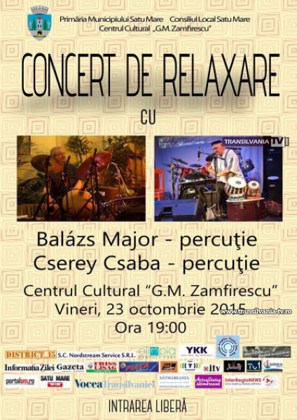 Vineri, 23 octombrie, ora 19.00 – Concert de relaxare cu Csaba Cserey și Balazs Major (Ungaria), sala mică a Centrului Cultural ”G.M.Zamfirescu”; intrarea liberă;