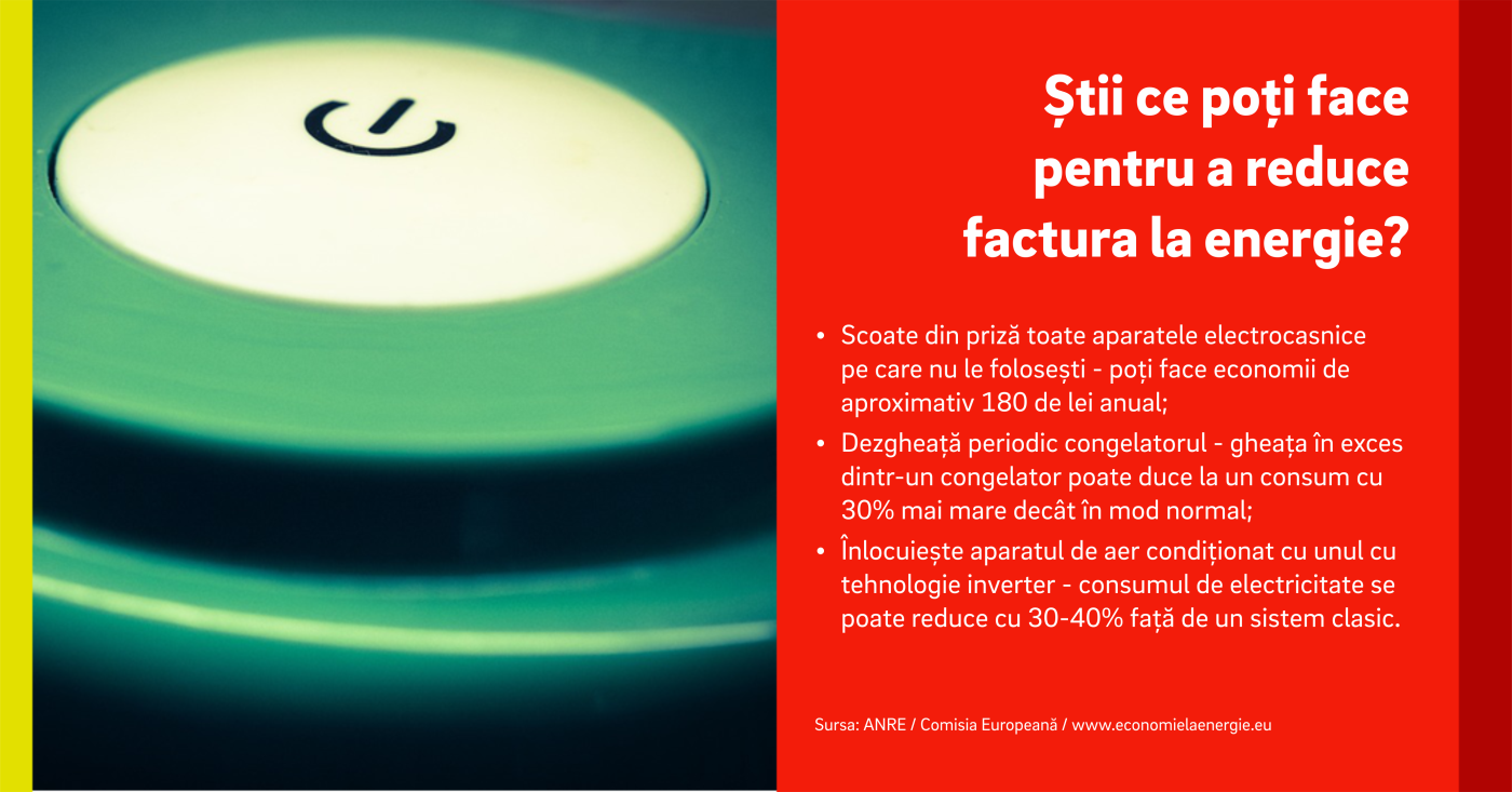 • Alimentarea cu energie a tuturor electrocasnicelor când acestea sunt în stand-by îți poate scoate din buzunar în plus circa 180 lei, anual, pentru fiecare locuinţă;• Un congelator poate consuma cu până la 30% mai multă energie dacă în el se adună gheaţă;• Utilizarea o singură dată a unui uscător de rufe poate necesită de două ori mai multă energie decât un ciclu de spălare;Aparatele electrocasnice fac parte din viaţa noastră, indiferent că vorbim de o combină frigorifică, maşină de spălat, televizor, computer etc. Tendinţa noastră este să cumpărăm, să avem, dar rareori ne punem întrebarea privind consumul de energie a tuturor acestor aparate. Mai ales atunci când nu le folosim.Când plecăm de acasă este recomandat să scoatem din priza, atât cât este posibil, electrocasnicele şi electronicele (TV, consolă de joc, PC, încărcătoare, dar nu şi frigiderul sau congelatorul), deoarece consumă energie, dar în acelaşi timp produc şi căldură. Pare greu de crezut, dar potrivit unor calcule putem vedea o diferenţă la factură de până la 180 de lei anual, dacă nu lăsăm aparatele în stand by. Orice aparat electronic lăsat în stand-by (vedeți acel led aprins) consumă între 40% şi 70% din energia pe care ar consuma-o dacă ar funcţiona. De aceea, e bine să scoatem din priză consumatorii de energie electrică în caz de neutilizare. Ca să ne fie mai ușor să facem asta, sunt foarte utile prizele programabile sau prelungitoarere cu întrerupător.Pasiunea pentru gătit determină mari degajări de căldură de la aragaz, plită sau cuptor electric şi suntem nevoiti să folosim hotele pentru evacuarea aromelor în exces, aburilor, dar şi a căldurii. De aceea, în perioadele călduroase este util să ne bucurăm de această pasiune seara, iar asupra nopţii să lăsăm bucătăria ventilată, pentru ca temperatura să revină la o valoare normală.O reaşezare în zone mai răcoroase din imobile a obiectelor electrocasnice (combină frigorifică, frigider, congelator) este benefică pentru că se reduce energia consumată şi implicit, scade cantitatea de căldură degajată prin funcţionarea lor. Un congelator poate utiliza cu până la 30% mai multă energie, dacă în el se adună gheaţă sau se află lângă o sursă de căldură. Toate aparatele electrocasnice emană căldură odată ce sunt pornite şi pentru a ne bucura de confortul casei pe perioada de vară, setarea aparatelor de aer condiţionat trebuie să o facem la o temperatură ce ne permite un consum optim de energie. În zilele când temperatura de afară este foarte ridicată, peste 30 ̊C, temperatura optimă ambientală este de 23 – 24 ̊C, nu mai puțin, chiar dacă aparatele de aer condiționat pot fi setate și până la 15 ̊C. Nu este lipsit de interes şi înlocuirea aparatelor de aer condiţionat vechi, cu unele cu tehnologie inverter ce folosesc o cantitate redusă de electricitate. Acest tip de tehnologie va reduce consumul cu 30-40% faţă de un sistem clasic. În multe dintre gospodării regăsim un consumator important de energie pentru prepararea apei calde menajere. Numai într-o perioadă de aproximativ câteva săptămâni un boiler electric poate echivala consumul unui frigider pe un an de zile. Tocmai de aceea, este util să avem în vedere montarea unui panou solar pentru prepararea apei calde menajere, ce ne va permite economii importante de energie cel puţin pentru perioada de vară. Dacă acest lucru nu este posibil, atunci este recomandat sa alegem un boiler electric din clasa energetică A, costul investiţiei fiind amortizat prin facturile lunare mai scăzute. Să mai adăugăm și că maşina de spălat îşi reduce consumul de electricitate cu o treime dacă se foloseşte un program de spălare cu mai puține grade Celsius. Mai exact, dacă spălați hainele la 30°C puteți economisi până la 60 de lei pe an.Confortul nostru depinde de tehnologiile pe care noi le utilizăm în propriile locuinţe, iar investiţiile noastre în aparatura electrocasnică cu eficienţă crescută se vor regăsi permanent în facturi mai mici de energie. Despre E.ON RomâniaGrupul german E.ON este unul dintre liderii pieţei de energie, având în România o prezenţă consolidată de-a lungul a circa 15 ani. Companiile-fanion ale grupului sunt Delgaz Grid şi E.ON Energie România, acestea desfăşurând activităţi de distribuţie, respectiv de furnizare a energiei şi a soluţiilor energetice pentru circa 3,1 milioane de clienţi. De la intrarea pe piaţa din România grupul E.ON a investit circa 1,6 miliarde de euro, în principal în modernizarea reţelelor. Totodată, valoarea contribuţiilor virate la bugetul de stat şi bugetele locale se ridică la 2 miliarde de euro.
