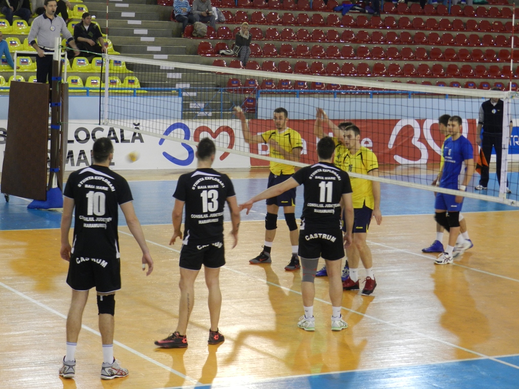 Meciul a început echilibrat, băimărenii câștigând primul set, cu 25-21, grație unor blocaje inspirate. Setul 2 a fost adjudecat de gazde și mai clar, cu 25-18, Gheorghe Socaciu fiind cel mai în formă jucător de la Știința Explorări. Băieții antrenați de Marius Botea și Sorin Pop au lăsat impresia că se îndreaptă spre o victorie lejeră, conducând în setul 3 cu 15-8. N-a fost însă așa, relaxarea băimărenilor, fiind taxată de șimleuani, care, impulsionați de Răzvan Vâlcelean au revenit spectaculos și s-au impus cu 25-23. Ultimul set a fost fără istoric, fijnd câștigat de gazde cu 25-11.