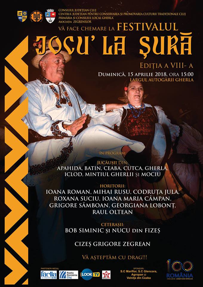 Tot duminică, 15 aprilie a.c., de la ora 15:00, se va desfășura Festivalul „Jocu’ la șură”, pe platoul Autogării din municipiul Gherla. Vor evolua jucăuși din Apahida, Batin, Ceaba, Cutca, Gherla, Iclod, Mintiu Gherlii și Mociu, acompaniați de ceterașii Bob Siminic și Nucu din Fizeș. De asemenea, vor cânta Ioana Roman, Mihai Rusu, Codruța Jula Pop, Roxana Suciu, Ioana Maria Câmpan, Grigore Sâmboan, Georgiana Lobonț și Raul Oltean.