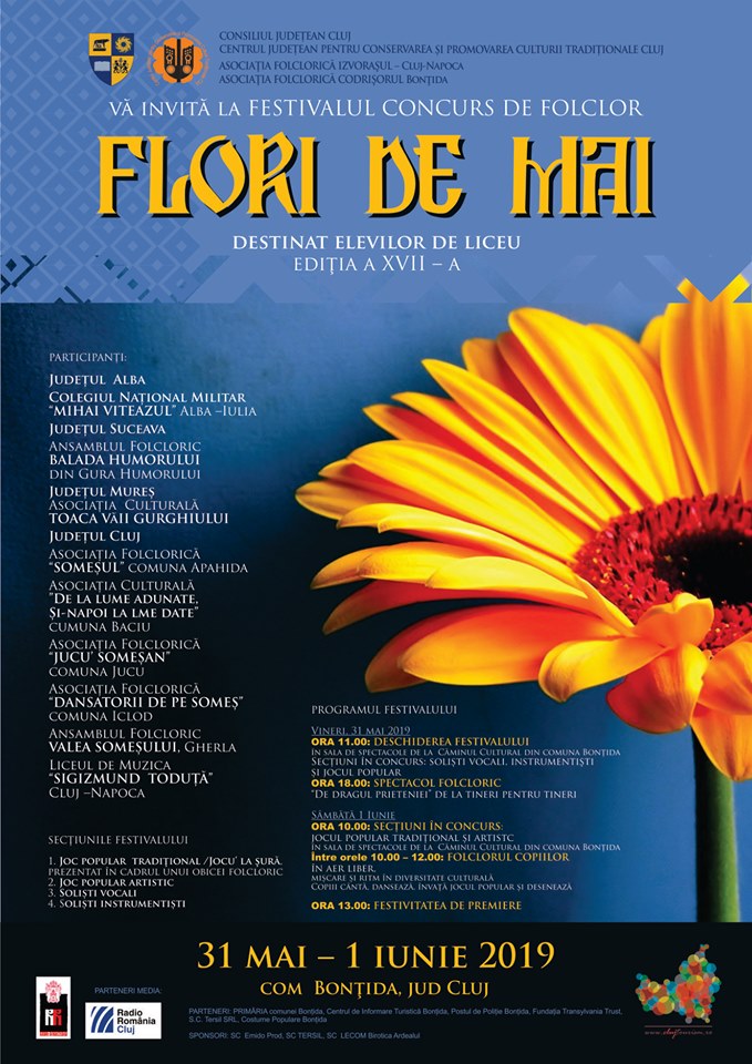 Centrul Judeţean pentru Conservarea şi Promovarea Culturii Tradiţionale Cluj, împreună cu Asociaţia folclorică „Izvoraşul” din Cluj-Napoca și Asociaţia Folclorică „Codrişorul” Bonţida, organizează în perioada 31 mai – 1 iunie 2019, cea de-a XVII – a ediție a Festivalului – concurs de folclor „Flori de mai”. Concursul este destinat elevilor de liceu și are ca scop descoperirea şi cultivarea valorilor folclorice autentice, prin însuşirea deprinderilor artistice adecvate, în vederea promovării şi conservării cântecului şi jocului popular, a obiceiurilor şi tradiţiilor din zona de provenienţă. Competiția se desfăşoară pe mai mai multe secţiuni: dans popular tradiţional/jocul la şură, prezentat în cadrul unui obicei folcloric, dans folcloric coregrafic, soliști vocali şi instrumentiști. În festival, la secţiunile solişti vocali şi instrumentişti, s-au putut înscrie și elevii de gimnaziu, clasa a VIII-a.