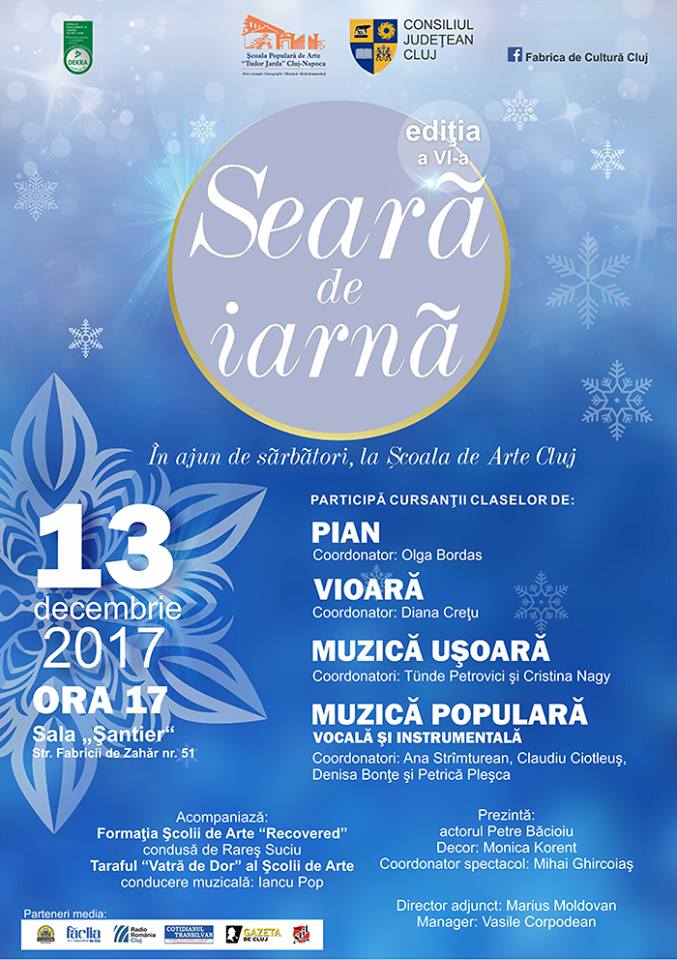 Astfel, prin participarea la Știriul „Seară de iarnă”, cei prezenți se vor putea bucura din plin de concerte la care vor participa cursanţii claselor de pian – coordonator Olga Bordas, vioară – coordonator Diana Creţu, muzică uşoară – coordonator Petrovici Tunde şi muzică populară, vocală şi instrumentală – coordonate de Ana Strîmturean, Claudiu Ciotleuş, Denisa Bonţe şi Petrică Pleşca. Spectacolul folcloric va fi acompaniat de Taraful „Vatră de Dor” – conducere muzicală Iancu Pop, iar cel de muzică uşoară de formaţia „Recovered” – coordonator Rareş Suciu.