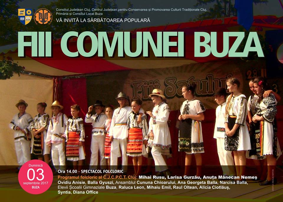 Duminică, 3 septembrie 2017, are loc Sărbătoarea populară „Fiii comunei Buza” manifestările urmând să debuteze de la ora 14.00 cu un spectacol folcloric, iar din partea C.J.C.P.C.T. Cluj vor fi prezenți soliștii vocali: Anuța Mânecan Nemeș, Larisa Gurzău și Mihai Rusu.